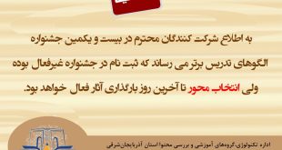 تمدید مهلت ثبت نام و تعیین محور قابل توجه دبیران دوره دوم متوسطه نظری ثبت نام و تعیین محور ۲۱ امین جشنواره الگوهای تدریس برتر با رویکرد نوآوری در فرآیند آموزش و یادگیری تا ۱۰ مهرماه تمدید شد . جهت ثبت نام و تعیین محور جشنواره به آدرس زیر مراجعه نمایید. Jashnvare.n2medu.ir شماره تلفن های پشتیبانی گروه های …